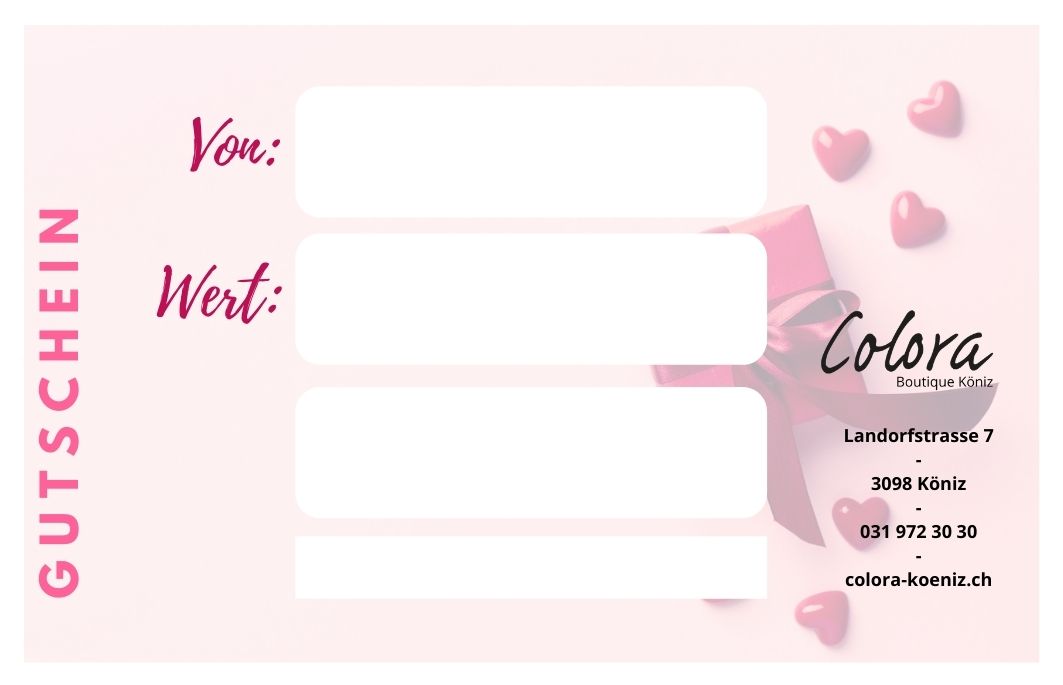 Natürlich sind auch andere Beträge möglich. Kontaktiere uns über boutique@colora-koeniz.ch oder 031 972 30 30.